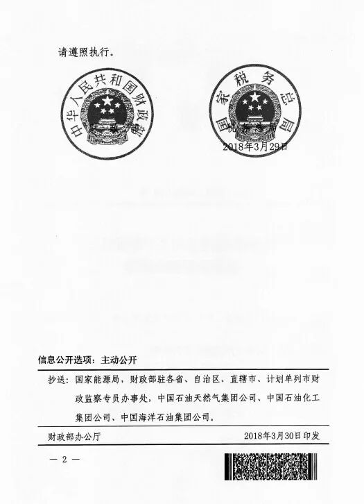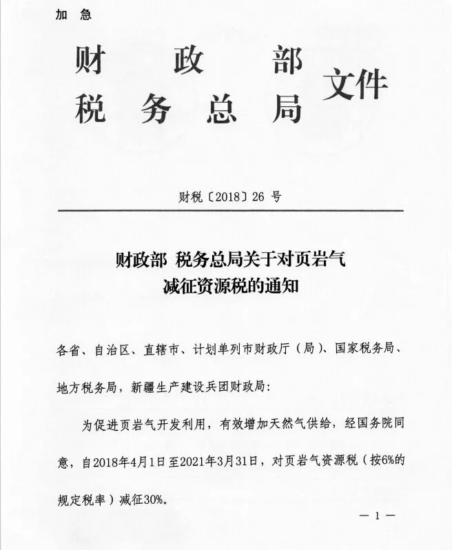 2018年3月30日,财政部、税务总局联合印发《关于对页岩气减征资源税的通知》。《通知》内容为:为促进页岩气开发利用,有效增加天然气供给,经国务院同意,自2018年4月1日至2021年3月31日,对页岩气资源税(按6%的规定税率)减征30%。 尽管该《通知》不过区区百十字,但在行业内却掀起了巨浪。